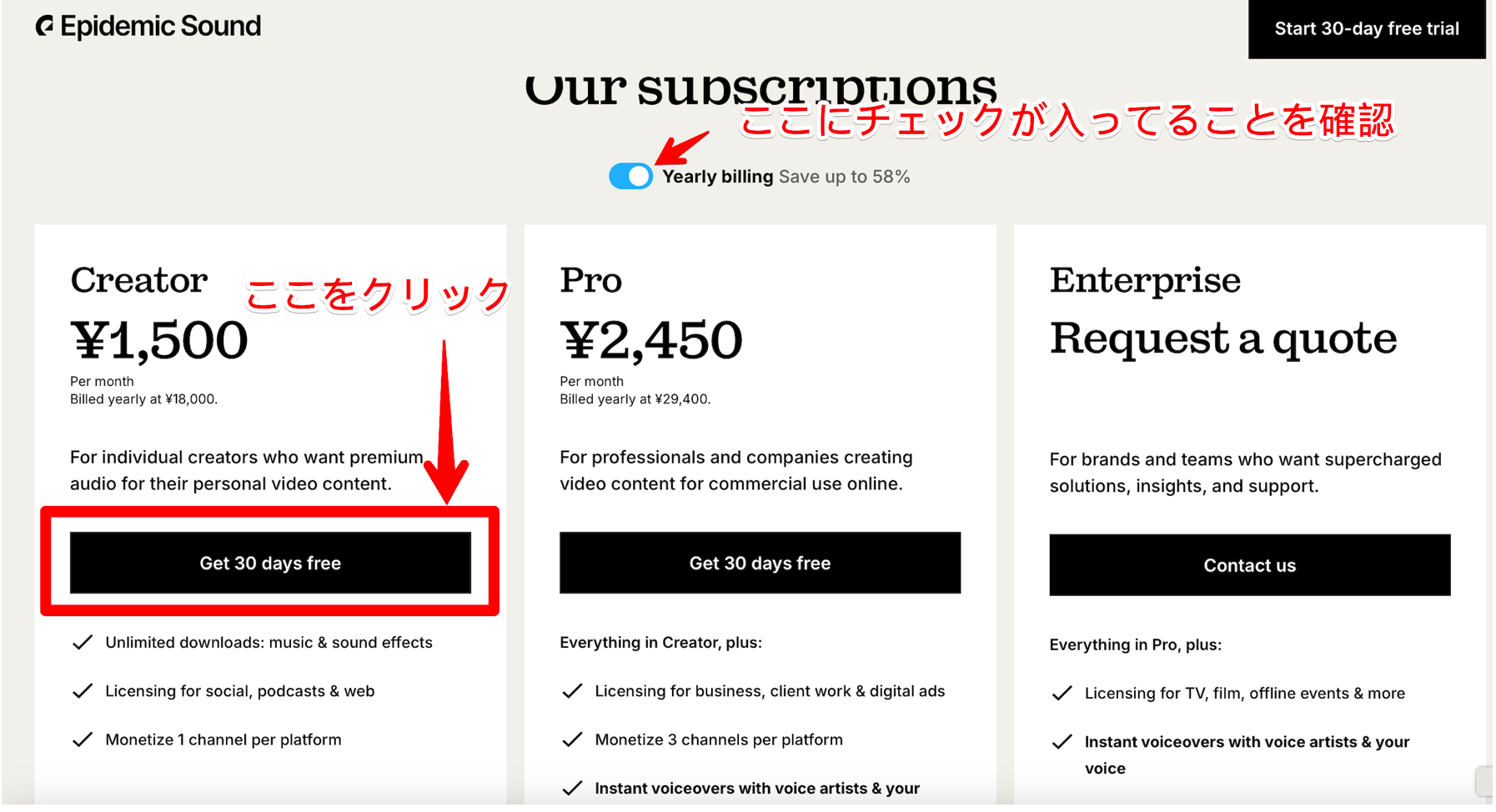 必ず、画面上部にあるトグルスイッチを「Yearly (年払い)」にチェックが入っているかご確認ください。