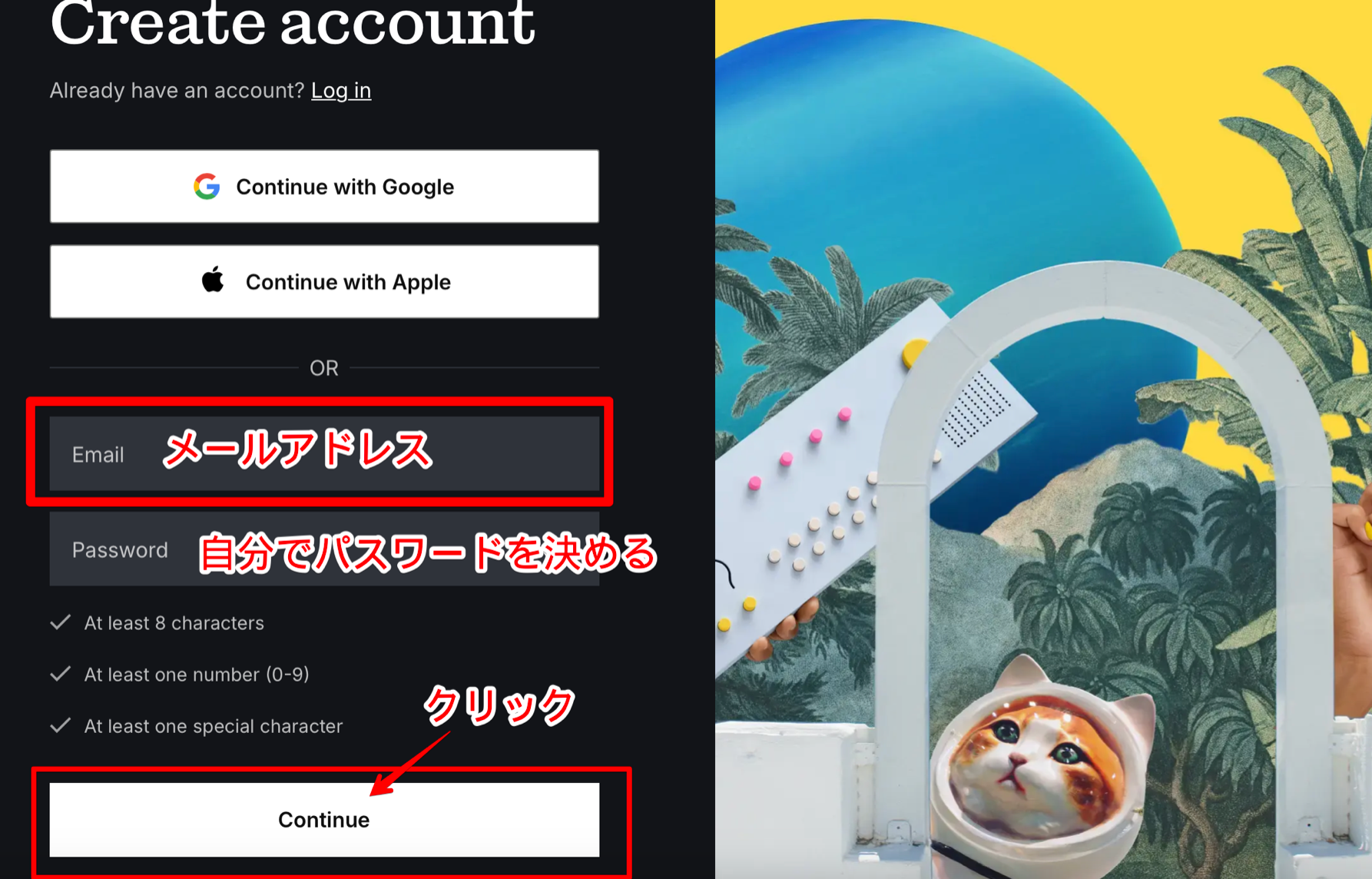 メールアドレスとパスワードを入力して、アカウントを作成しましょう。