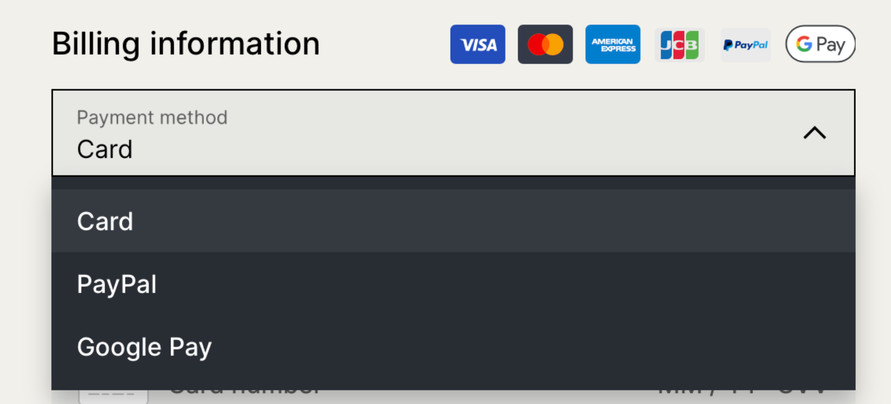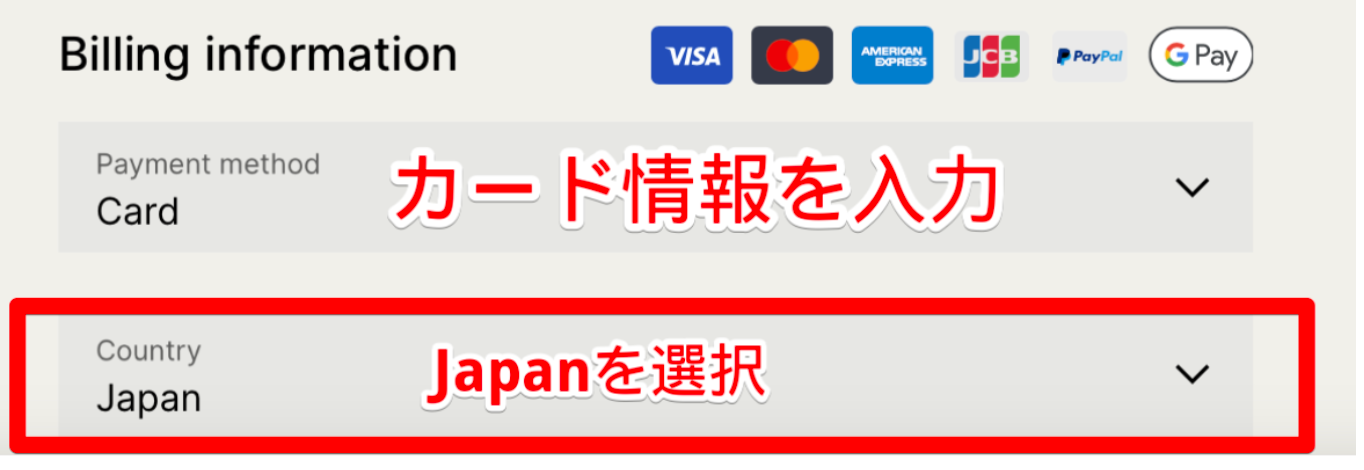 クレジットカード払いか、Paypal払い、Google Pay払いを選択できます。