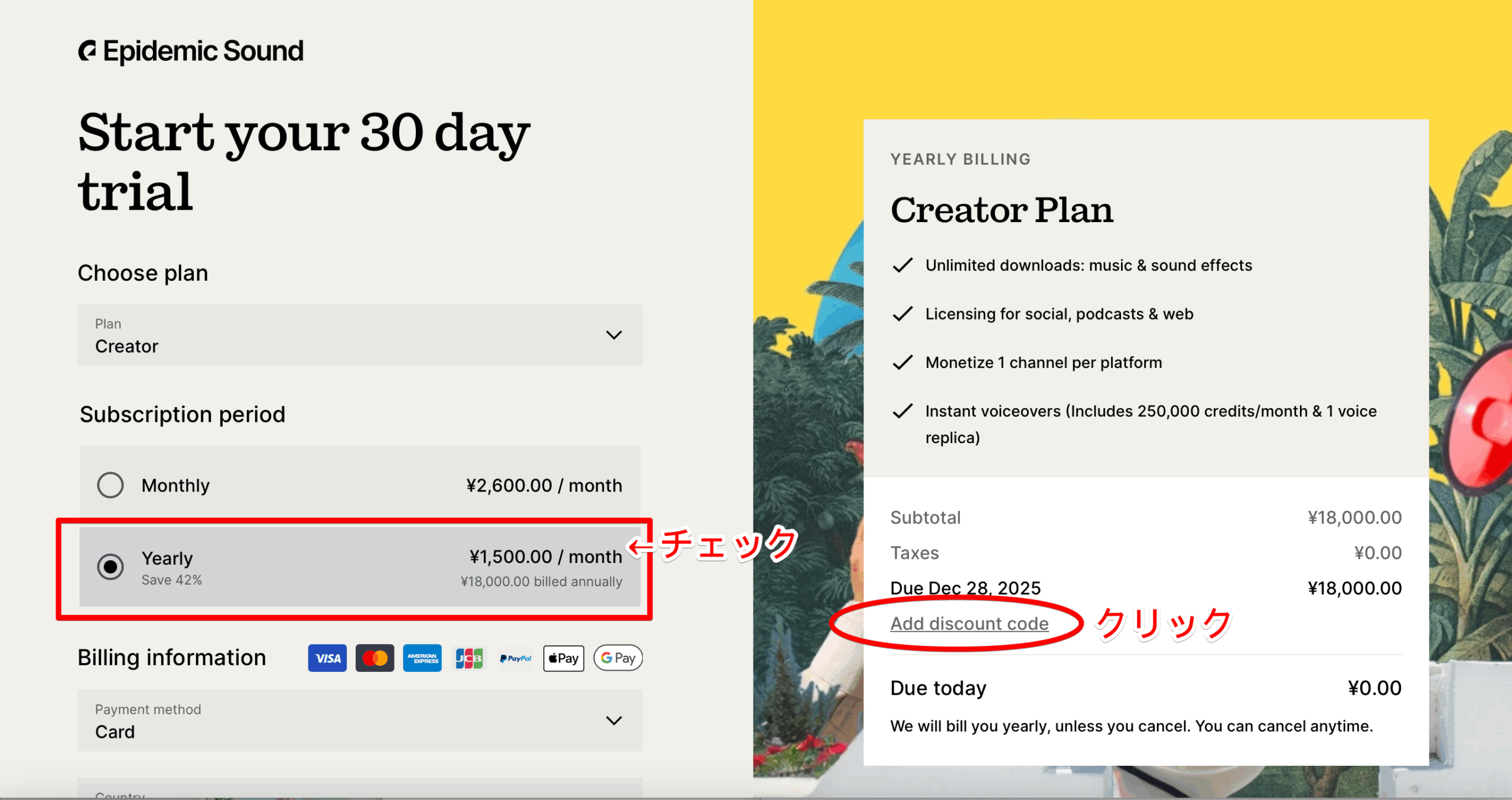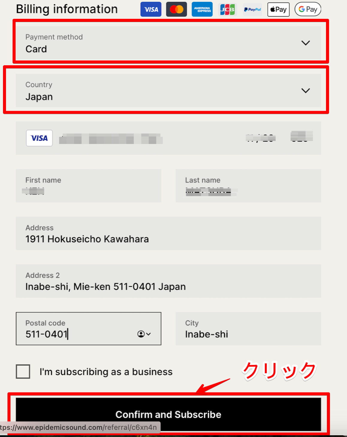「i,m subscribing as business」→ビジネスとしてエピデミックサウンドを登録する場合は、チェックボタンにチェック。