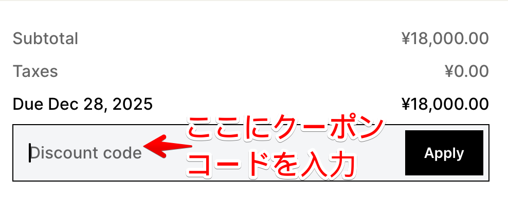 有効なクーポンをお持ちの場合は、ページ右側にある「Add discount code」をクリックしてください。